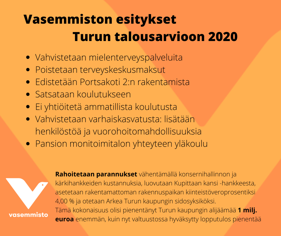 Miksi Vasemmistoliitto ei ollut mukana enemmistössä, kun Turun vuoden 2020 talousarviosta päätettiin? Haluan tuoda keskusteluun nyt oman näkökulmani.