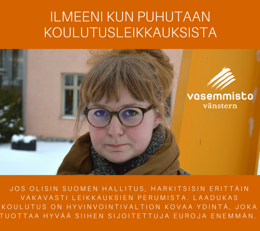 Koulutuksesta leikkaaminen on lyhytnäköistä, sillä koulutusleikkaukset vaikuttavat paitsi yksilöiden menestymiseen, myös suomalaisen yhteiskunnan ja elinkeinoelämän virkeyteen. Maan hallituksen tekemät leikkaukset tuntuvat kaikilla koulutusasteilla varhaiskasvatuksesta korkeakouluihin. Laadukas koulutusjärjestelmämme on keskeinen osa hyvinvointivaltiota, ja siitä ei missään tapauksessa pitäisi leikata – sen sijaan koulutukseen ja varhaiskasvatukseen on panostettava ja sitä on vaalittava.